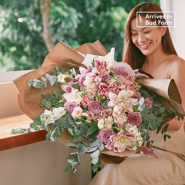 Featuring rare and seasonal Roselilies, also known as the Double-petaled lilies, nestled in a garden of flowers including roses, matthiolas, and eustomas, this bouquet is truly one of a kind. Delicately put together in colors of pink and purple, it's ideal for expressing love, respect, thanks, or just because.Â