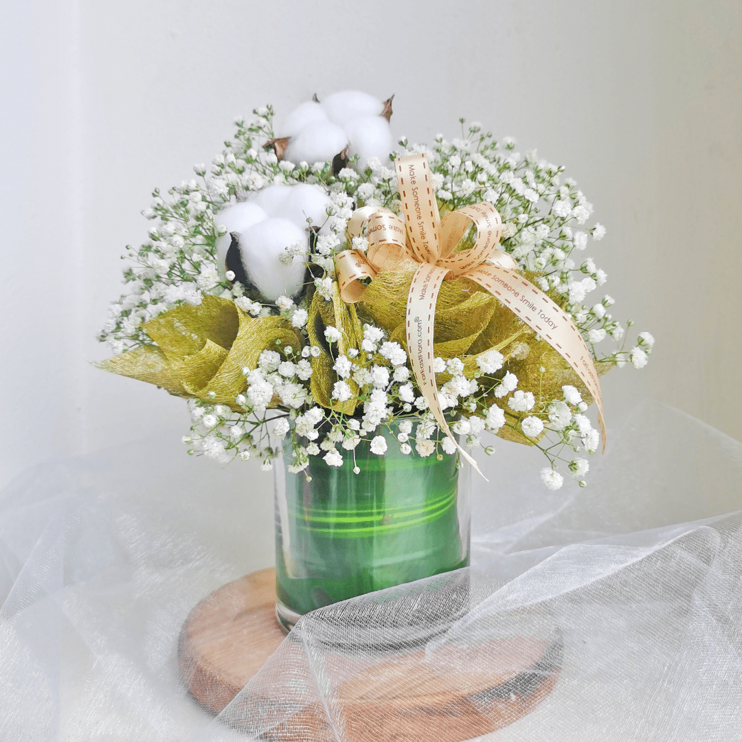 Everyone loves baby's breath because it symbolizes everlasting love and innocence. Best thing, they can be kept as dried flowers for display afterwards! Make your loved ones’ day with this beautiful arrangement of cotton flower & baby's breath.